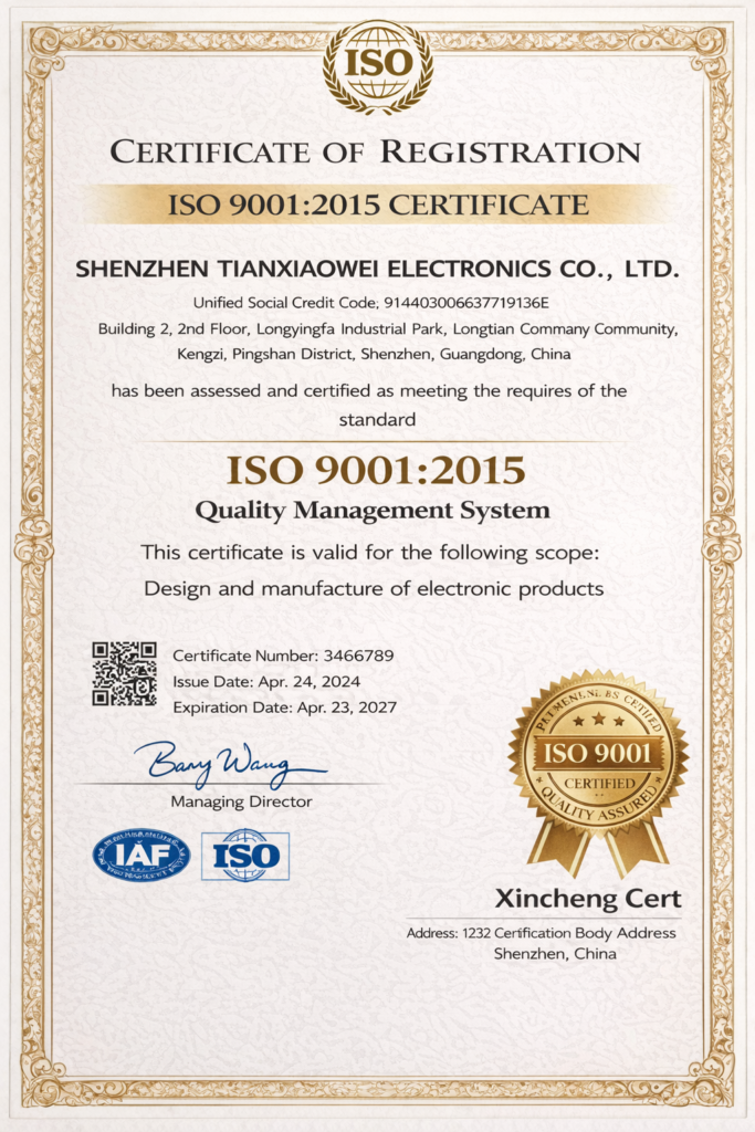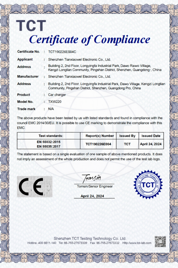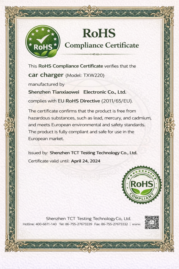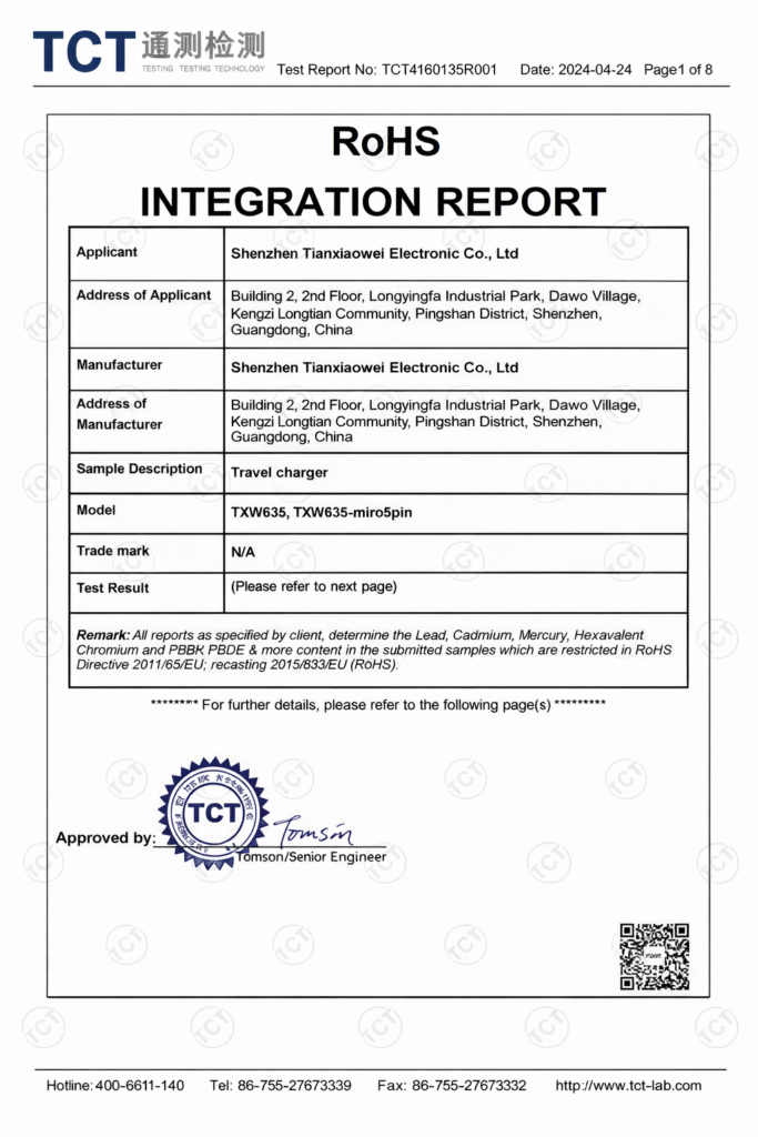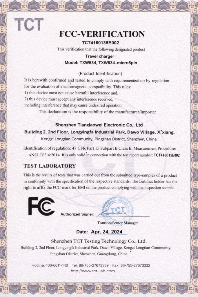 Tianxiaowei is a Shenzhen-based OEM/ODM manufacturer of chargers, adapters, and custom cable assemblies. Founded in 2005, the factory operates with a monthly capacity of approximately 200,000 units and maintains a defect rate below 0.02%. Products comply with UL, CE, RoHS, FCC, SAA, and KC standards and are supplied to customers in more than 40 countries worldwide.