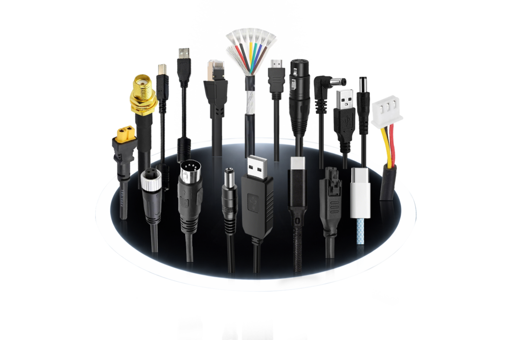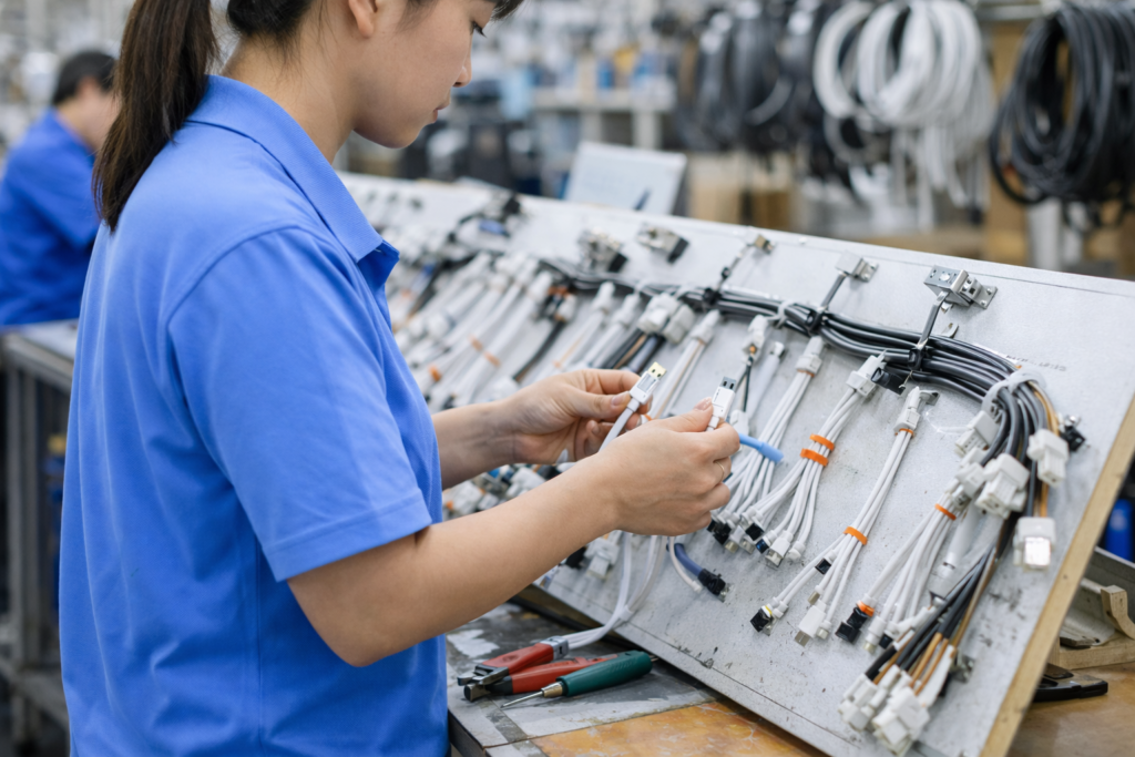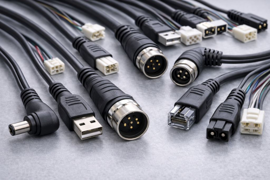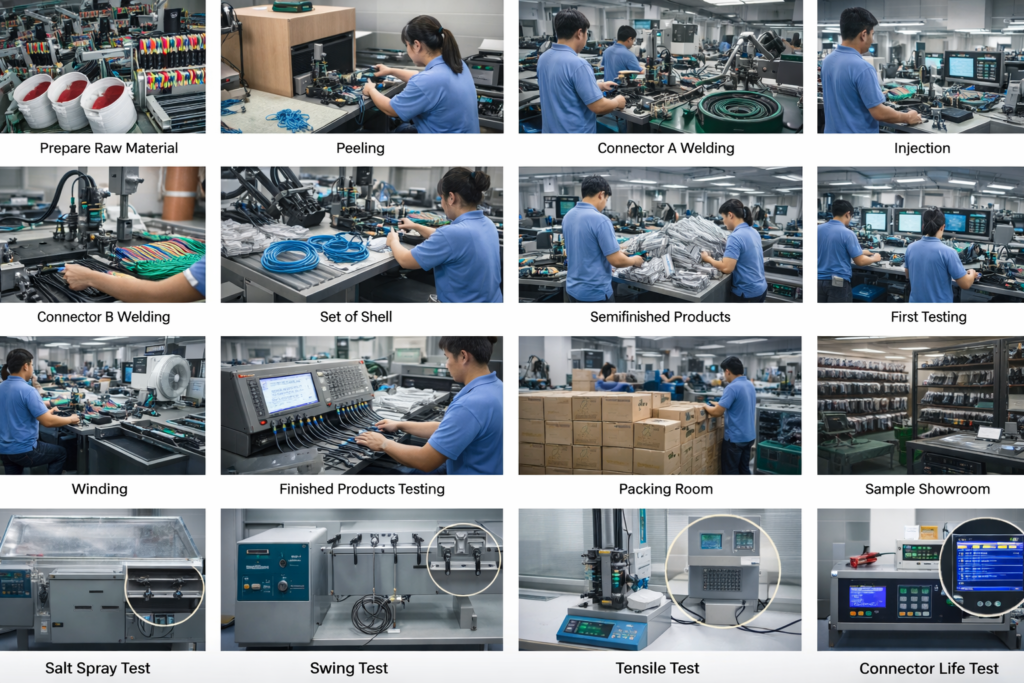 Factory-direct manufacturing for charging cables, DC power cables, and wire harnesses. In-house cutting/crimping/soldering + overmolding + 100% functional testing.