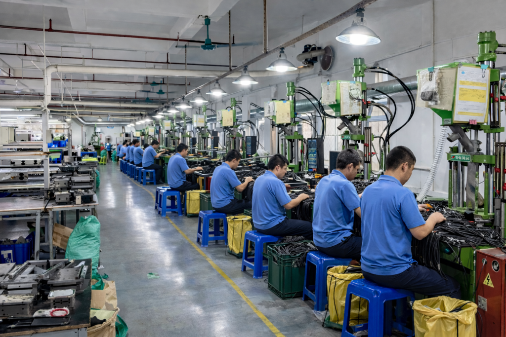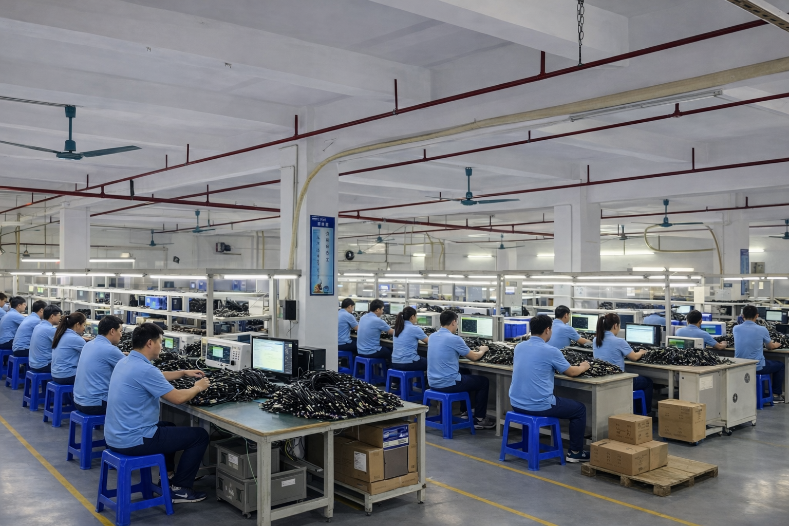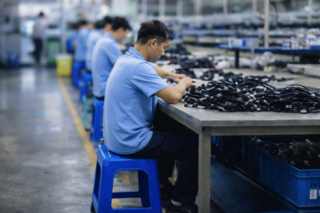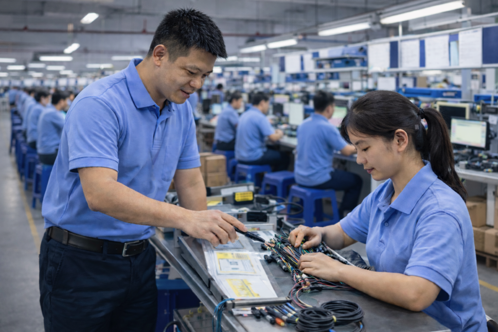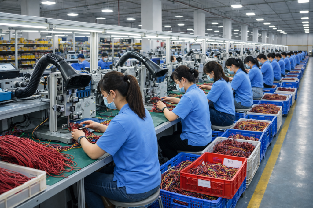 Multiple operators assembling cable hamesses on rel production line,supporting stable OEM mass production with consistent quality control.